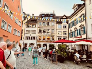 Mitte der Woche meinte es das Wetter nicht mehr ganz so gut mit den Ausflüglern. „Literweise Hochsommer“ (Regen) begleitete sowohl die Schiffsrundfahrt auf dem Bodensee als auch die Stadtführung in Lindau, u.a. mit dem reich verzierten alten Rathaus, der altehrwürdigen Peterskirche und der imposanten Hafeneinfahrt. Die aufgekommene Bewölkung verhinderte in erster Linie auf dem Berg Pfänder und am Faschinajoch den erhabenen Ausblick. In Bregenz ist die Figur des „Seebrünzler“ ebenso ein Symbol wie einer der seltenen Pilzkioske. Letzte Station auf dieser Reise war eine Landpartie durch den Bregenzerwald, vorbei am mythenreichen Massiv Kanisfluh und dem Wälderbähnle, über das Bödele hin zum idyllischen Ort Schwarzenberg. Eines der schmucken „Wälder-Holzhäuser“ ist mit Angelika Kauffmann – eine bedeutende Künstlerin ihrer Zeit – auf der alten 100-Schilling-Banknote verewigt. Der Erlebnishof „Ur Alp“ machte seinem Namen alle Ehre. Ach, es gäbe ja noch so vieles zu berichten. Darum hier stichwortartig nur das Bedeutsamste: der mit einem Architekturpreis ausgezeichnete islamische Friedhof in Altach, der Austragungsort int. Mehrkampf-Meetings im kleinen Ort Götzis, das für die Schubertiade berühmte Hohenems sowie das schneereichste Dorf Damüls. Dornbirn, das am Karren gelegene größte Dorf der Monarchie, ist bekannt für seine von prächtigen Gärten umgebenen, zauberhaften Villen. Zuguterletzt die tolle Stadt Ulm mit dem weltweit höchsten Kirchturm am monumentalen Münster und im Fischerviertel u.a. die klingende Brücke, das Kässbohrer Haus, das Schiefe Haus und der Metzgerturm. Mit dem guten Hören ist das auch so eine Sache: Da wird schnell mal aus Kebab ein Zwieback. Bleibt also nur noch Danke zu sagen: Zuallererst danke an alle Reisenden für das harmonische Miteinander. Eine Einheit, von der sogar die Hotelchefs ganz begeistert waren. Sie spendierten allen einen Hausschnaps und verabschiedeten persönlich die Gruppe.