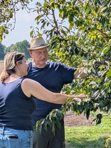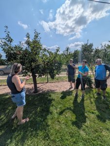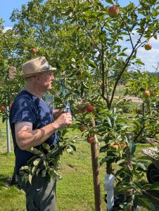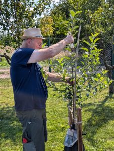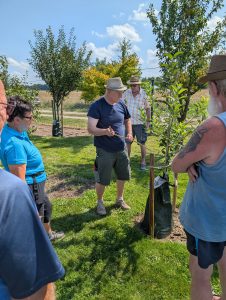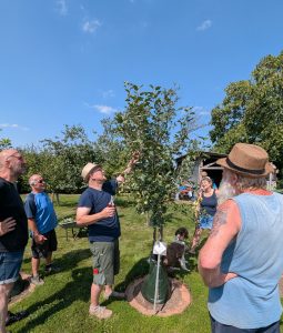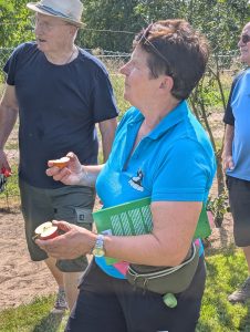 Unser 2. Vorsitzender Wolfgang Bender erklärt den Teilnehmern, auf was es beim Sommerschnitt der verschiedenen Obstsorten ankommt. Es wurde auch der ein oder andere Apfel verkostet.
