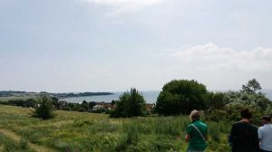 6. Tag: Zuerst kurven wir durch die Innenstadt von Binz mit ihren schön verzierten Häusern in „Bäderarchitektur“. Dann führt der Weg über wunderschöne Alleen (die Buche dominiert auf Rügen) bei Sonnenschein nach Sellin, das eine sehr lange Seebrücke hat, und weiter auf die Halbinsel Mönchgut (1252 lebten hier Mönche) nach Klein-Zicker. Die Bewohner haben ihre Vorgärtchen liebevoll mit Rosen aller Sorten, Hibiscus und Rittersporn bepflanzt. Vom Aussichtspunkt oben in der Hügellandschaft hat man einen traumhaften Blick. Die Landschaft steht unter Naturschutz; hier blühen viele sandliebende Pflanzen und sogar einige Orchideen. Eine ganz typische Pflanze hier ist der Sanddorn, aus dem allerlei leckere Souvenirs angeboten werden (Gelee, Likör, Wein, Eis).
